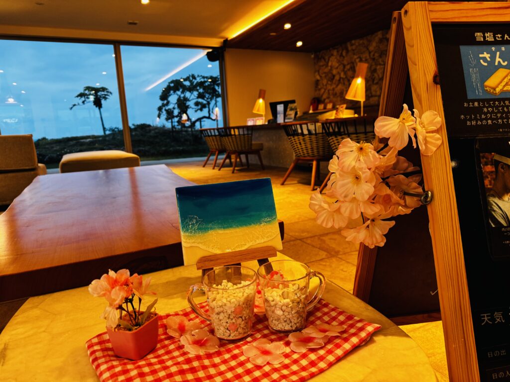 当館のフロントも、桜の装飾で華やかな“お花見仕様”となっております。ロビーでは、ゆったりとビーチを眺めながら、当館ならではの春のひとときをお楽しみいただけます。